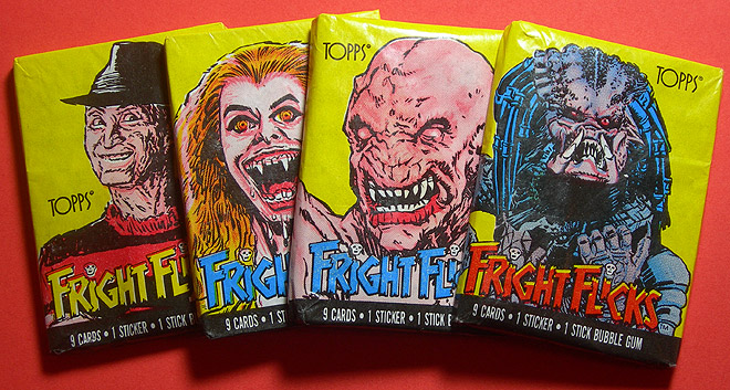 Back in October of this year, I was scrolling through Bluesky and came across a thread of people talking about Fright Flicks, a line of 90 trading cards and 11 stickers released by Topps in 1988 that featured scenes from popular horror movies of the time. There were four wax paper wrappers (the paper gives old trading cards the nickname “waxpacks”) with artwork of Freddy Krueger, The Predator, Pumpkinhead, and Vampire Amy from Fright Night, drawn in a very distinct style that was common on old trading card packaging.