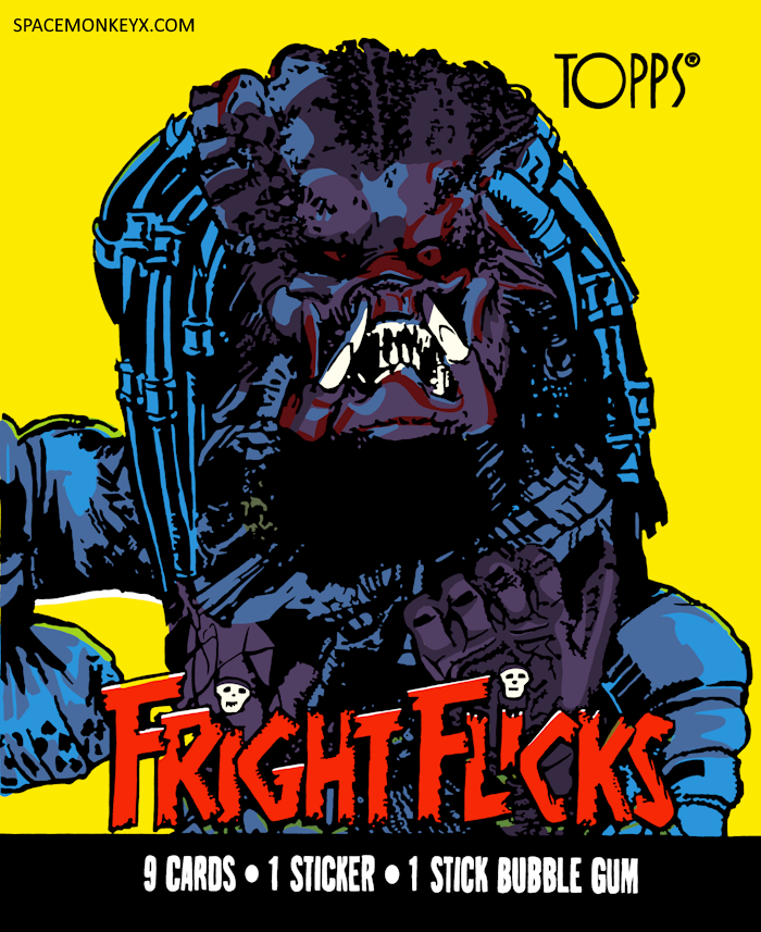 Back in October of this year, I was scrolling through Bluesky and came across a thread of people talking about Fright Flicks, a line of 90 trading cards and 11 stickers released by Topps in 1988 that featured scenes from popular horror movies of the time.  There were four wax paper wrappers (the paper gives old trading cards the nickname “waxpacks”) with artwork of Freddy Krueger, The Predator, Pumpkinhead, and Vampire Amy from Fright Night, drawn in a very distinct style that was common on old trading card packaging.